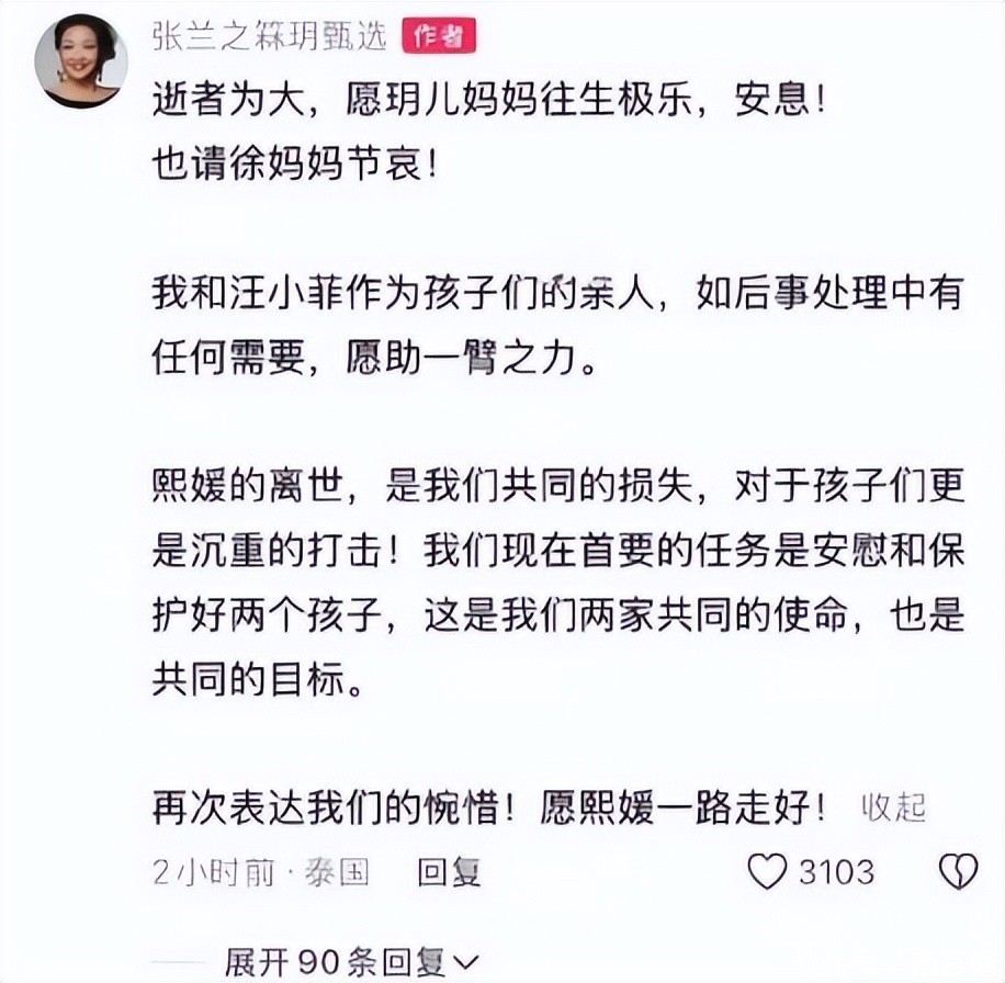 不过在得知大S死讯后,张兰在网上公开悼念大S,两家人之间的恩怨纠葛也算一笔勾销了。